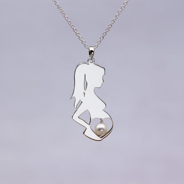 Ett fint och elegant hänge i Sterling silver 925 som kan tillverkas i 18K guld vid önskan. Ett halsband av en gravid kvinna med en pärla i mage som symboliserar ett nytt liv som växer. En fint och meningsfullt gåva för hyllning till moderskapets resa. Pärlan är en äkta sötvatten pärla av hög kvalitet.