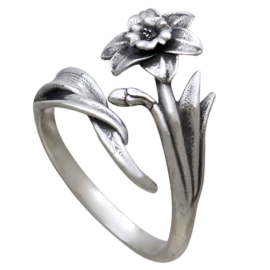 Justerbar silverring med påsklilja, mars månadsblomma.
